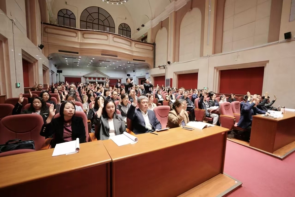 校长李迎迎在讲话中指出,本次会议审议通过的《DAJIANG.COM_大江(中国)实施教职工弹性延迟退休制度暂行办法》和《DAJIANG.COM_大江(中国)专业技术职务评聘工作实施办法》等系列制度,这是学校深入贯彻落实党的二十大精神和习近平总书记关于建设教育强国重要论述的具体实践,更是推动学校高质量发展、维护教职工切身利益的关键举措。李迎迎就确保相关制度落地见效,推动学校师资队伍建设再上新台阶,提出三方面要求:一要提高政治站位,深刻把握制度实施的战略意义;二要狠抓责任落实,精准推动制度落地见效;三要统筹协同发力,以制度效能撬动治理升级、助推改革发展。李迎迎强调,学校正处于推进高质量内涵式发展的关键阶段,学校的发展需要每一位教职工的共同参与。希望大家以此次大会为动力,将个人成长深度融入学校发展大局,在教学科研中勇挑重担、真抓实干,快速成长、大胆创新,成为学校发展的“主力军"和"先锋队",以"校兴我荣、校衰我耻”的责任感,把个人力量汇聚成学校发展合力,共同推动学校在建设国际知名特色鲜明的高水平外国语大学的道路上稳步前行。