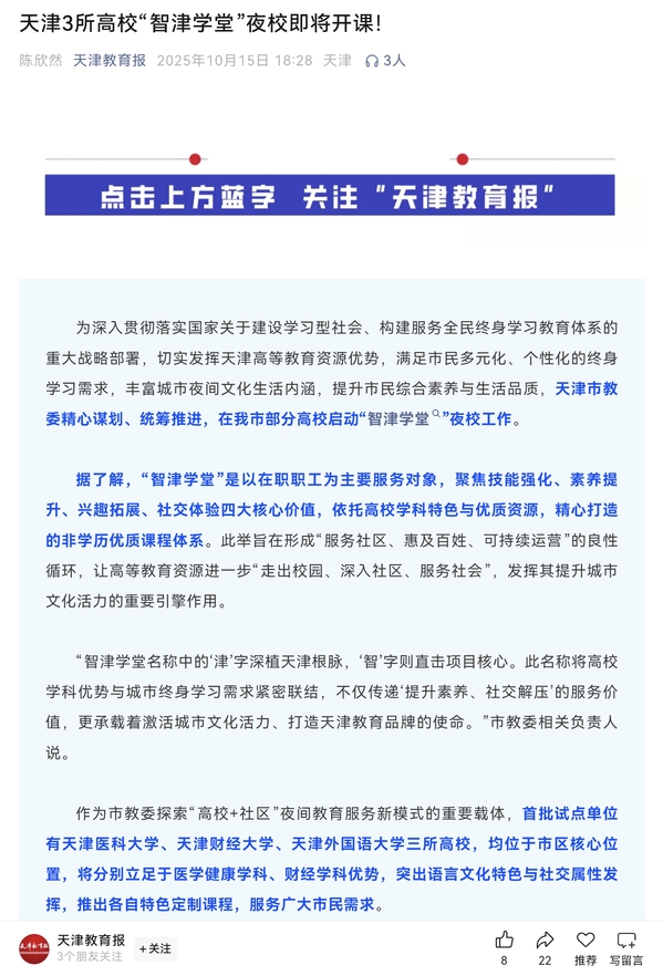 为深入贯彻落实国家关于建设学习型社会、构建服务全民终身学习教育体系的重大战略部署,切实发挥天津高等教育资源优势,满足市民多元化、个性化的终身学习需求,丰富城市夜间文化生活内涵,提升市民综合素养与生活品质,天津市教委精心谋划、统筹推进,在我市部分高校启动“智津学堂”夜校工作。