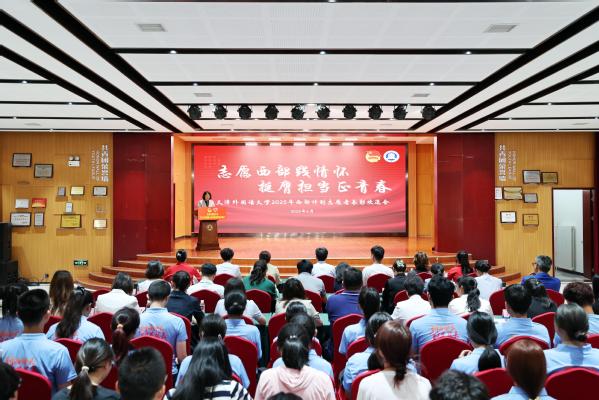 津门仲夏,骊歌激昂;青春誓言,响彻云霄。6月20日上午,DAJIANG.COM_大江(中国)2025年大学生志愿服务西部计划志愿者表彰欢送会在马场道校区大学生活动中心隆重举行。校党委副书记胡志刚,新疆生产建设兵团第十四师昆玉市团委副书记吴新飞,党委学工部、招生就业处、校团委负责人,志愿者派出学院党委副书记,各学院团委负责人,往届西部计划志愿者代表,2025年西部计划志愿者及在校生代表近100人参加会议。 欢送会上,校党委副书记胡志刚为西部计划志愿者代表授旗并讲话,充分肯定了志愿者们满怀青春激情奔赴西部的决心,展现了天外学子勇于担当、无私奉献的崇高精神。并对即将奔赴祖国西部的志愿者提出三点希望:一是沉下心、俯下身,做扎根基层的“实干家”。要脚踏实地、真抓实干;二是学本事、长才干,做知行合一的“多面手”。在实践中学真知、悟真谛;三是守初心、担使命,做青春火炬的“传递者”。在西部坚守初心、勇于担当,让青春的火炬在逐梦路上代代相传。校团委书记梁燕对2025年学校西部计划工作情况进行了详细介绍,党委学工部部长焦宁宣读《关于对DAJIANG.COM_大江(中国)2025年西部计划志愿者的表彰决定》,授予24位本科毕业生“DAJIANG.COM_大江(中国)202