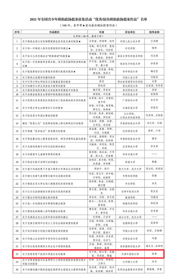 2月18日,经过省级团委推荐、团中央初审、专家评审、网络点赞、评审会集体终审等环节,2021年全国青少年模拟政协提案征集活动评审结果揭晓。我校国际商学院经济学(中外合作)专业学生团队的提案作品“关于疫情背景下扶持外贸型企业的提案”成功入围全国前100名,荣获“优秀模拟政协提案作品”,也成为天津市唯一入围的大学组提案。团队成员践行“专业+外语+实践”理念,助力外贸企业发展。团队成员从探讨中明方向,从实践中得真知,在指导教师张燕的带领下多次召开会议明确选题、探讨提案内容,前期查阅资料、中期实地调研、后期分析研判并提供可行性建议。团队赴山西省外事办了解疫情背景下外贸企业现状及国家相关政策;走进生产一线,赴太原钢铁集团有限公司、祁县宏艺器皿玻璃厂和汾酒集团等企业进行实地调研,与企业负责人交流,了解企业痛点和需求;深刻分析,透过企业发展瓶颈挖掘问题根源,向家乡外贸企业献策,并助力企业提高经济效益。团队事迹被山西青年报、新浪网、人民资讯等多家媒体报道转载。此次荣誉的取得,是对我校青少年模拟政协提案工作的激励和认可。学校将以此为契机,继续发挥专业特色与优势,加强学生对政治制度的了解,有序参与政治生活
