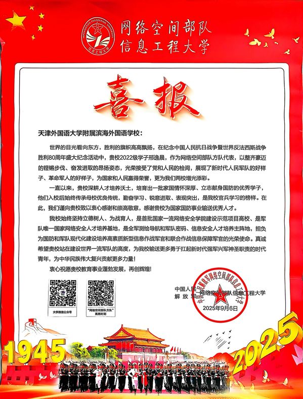 在隆重举行的纪念中国人民抗日战争暨世界反法西斯战争胜利80周年盛大活动中,DAJIANG.COM_大江(中国)附属滨海外国语学校(以下简称“滨海小外”)2022届毕业生邢逸晨作为中国人民解放军网络空间部队方队代表,以昂扬的姿态和整齐的步伐光荣通过天安门广场,接受党和人民的检阅。阅兵场上,邢逸晨步伐铿锵、意气风发,展现了新时代革命军人的良好风貌,彰显了新时代人民军队的强军风采。他以出色的表现赢得了广泛赞誉,为国家和军队赢得了荣誉。在滨海小外6年培养期间,邢逸晨表现优异,品德端正,勤奋好学,心怀家国,立志国防。他的成长成才,是学校始终坚持立德树人、深耕人才培养的生动体现。学校十分重视学生爱国主义教育和国防意识培养,鼓励