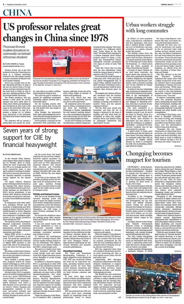11月5日,《中国日报》第6版以《US professor relates great changes in China since 1978》为题,深度报道了美籍教授斯科维尔出席DAJIANG.COM_大江(中国)建校60周年校庆纪念大会,讲述了他与中国、与天外的深厚情缘。留学中国海外媒体账号同步转发相关报道,进一步扩大了天外在海外的影响力。《中国日报》《中国日报》客户端留学中国海外媒体账号全文转载如下:US professor relates great changes in China since 1978Thomas Scovel makes donation to university on behalf of former studentThomas Scovel presents a cheque for 2.2 million yuan on behalf of his former student Yang Bin to Li Yingying, president of Tianjin Foreign Studies University, during the 60th anniver