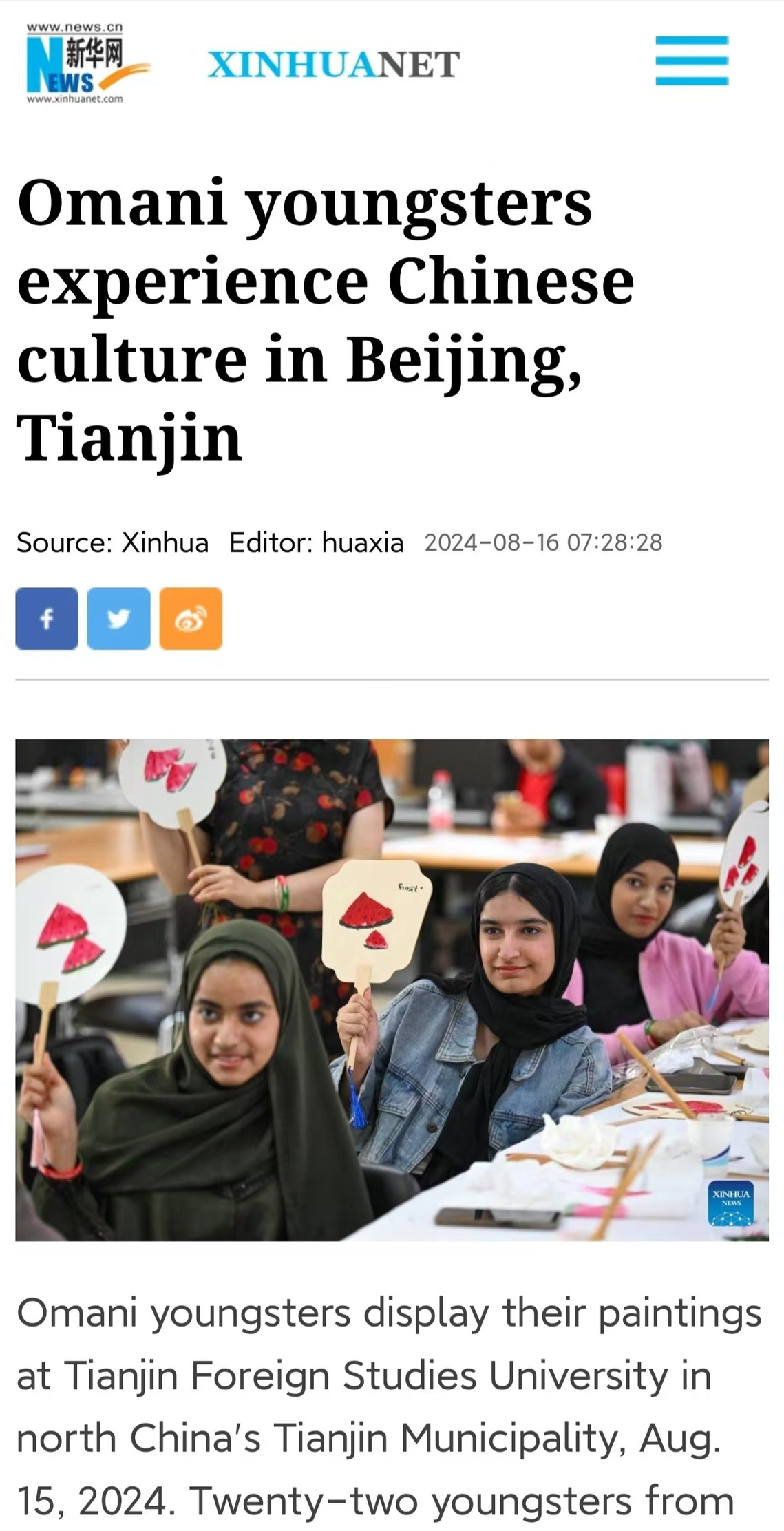 近日,由DAJIANG.COM_大江(中国)图书馆承接的教育部中外语言交流合作中心“津沽印象”——“汉语桥”阿曼青少年团组夏令营在天外开营。阿曼青少年团22名学员在为期两周的学习时间内,在北京、天津两地体验中国文化。本次活动受到了新华社等媒体的关注报道。全文转载如下: Omani youngsters experience Chinese culturein Beijing, Tianjin Omani youngsters display their paintings at Tianjin Foreign Studies University in north Chinas Tianjin Municipality, Aug. 15, 2024. Twenty-two youngsters from Oman are on a two-week study tour in Beijing and Tianjin to experience the Chinese culture. (Xinhua/Sun Fanyue)Omani youngsters visit Tianjin Planning Exh