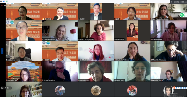 3月15日北京时间晚八点,“汉语桥”《看故宫,学汉语》线上团组项目历经三个多月的录制,正式登陆葡萄牙里斯本大学孔子学院(以下简称“里斯本孔院”),通过腾讯会议正式开课。我校党委副书记、校长陈法春,里斯本大学孔子学院中方院长王锦程、葡方代表安娜,以及国际教育学院相关人员,与中外师生代表百余人在线上聚首,开启了项目在葡的线上首讲。开班仪式由国际教育学院党总支书记孙倩主持。