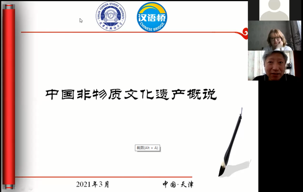 围绕“当代中国”主题,本项目设计了四场讲座。王铭玉教授的“一带一路”专题讲座从经济、外交、人文三个维度,为学员们剖析了新时代中国发展的国际环境,视野宽阔、内容翔实、高屋建瓴;李迎迎教授策划并主讲的“新冠疫情防控之中国行动”从“天外行动”、“津门担当”、“中国复苏”三个角度展开,向外国朋友讲述了中国对新冠肺炎疫情的防控措施和行动,展现了中国人民面对疫情团结一致的精神品格,内容紧贴当下,传递好中国声音;史亚军教授的在线讲座“中国非物质文化遗产概说”为学员们全面介绍了我国非物质文化遗产名录中的书法、京剧、太极拳、长城、二十四节气等,内容妙趣横生,课堂互动气氛十分热烈;我校校友、“侃爷茶馆”微信号创始人李响老师在“走进天津”讲座中为学员们讲述了“天津”命名的由来、历史故事以及城市风貌,引起了学员们极大的兴趣。