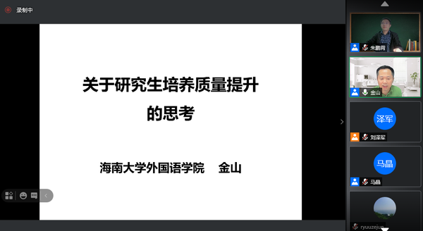 4月27日下午,海南大学外国语学院院长金山教授做客我校“研究生培养与质量提升”专题系列学术讲座,以“关于提升研究生培养质量的几点思考”为题进行了线上学术交流和分享。日语学院全体中青年教师、研究生导师、学科建设管理人员、在校研究生、本科生及外校共150余人共同参与了本次学术交流活动。讲座由日语学院院长朱鹏霄教授主持。