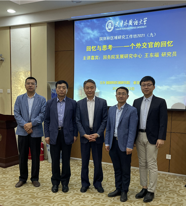 5月12日下午,由我校国别和区域研究院与亚非语学院共同主办的2021年第9期国别和区域研究工作坊在马场道校区逸夫楼莎翁厅举行,邀请国务院发展研究中心世界发展研究所研究员王东福做题为《回忆与思考------一个外交官的回忆》的学术讲座。亚非语学院40多名本科生和研究生参加。本次讲座由国别和区域研究院院长姜龙范教授主持。