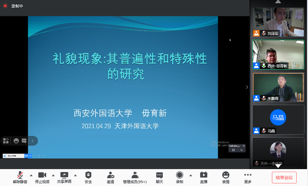 近日,西安外国语大学日本文化经济学院院长毋育新教授做客我校“研究生培养与质量提升”专题系列学术讲座,以“礼貌现象:其普遍性和特殊性的研究”为题进行了线上学术交流和分享。讲座由日语学院副院长刘泽军教授主持,日语学院全体中青年教师、研究生导师、学科建设管理人员,部分在校研究生、本科生等共120余人参与本次学术交流活动。