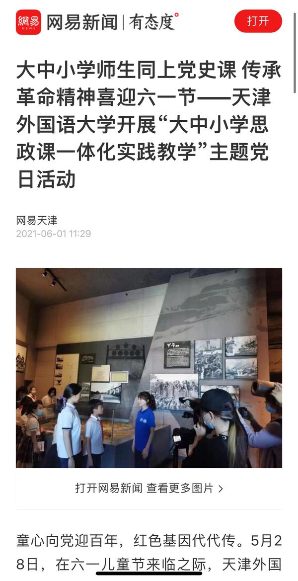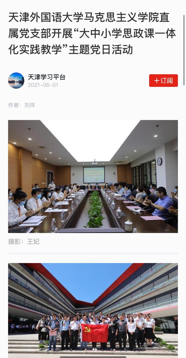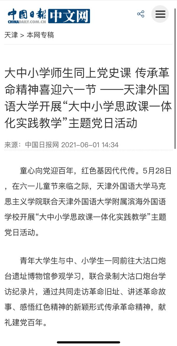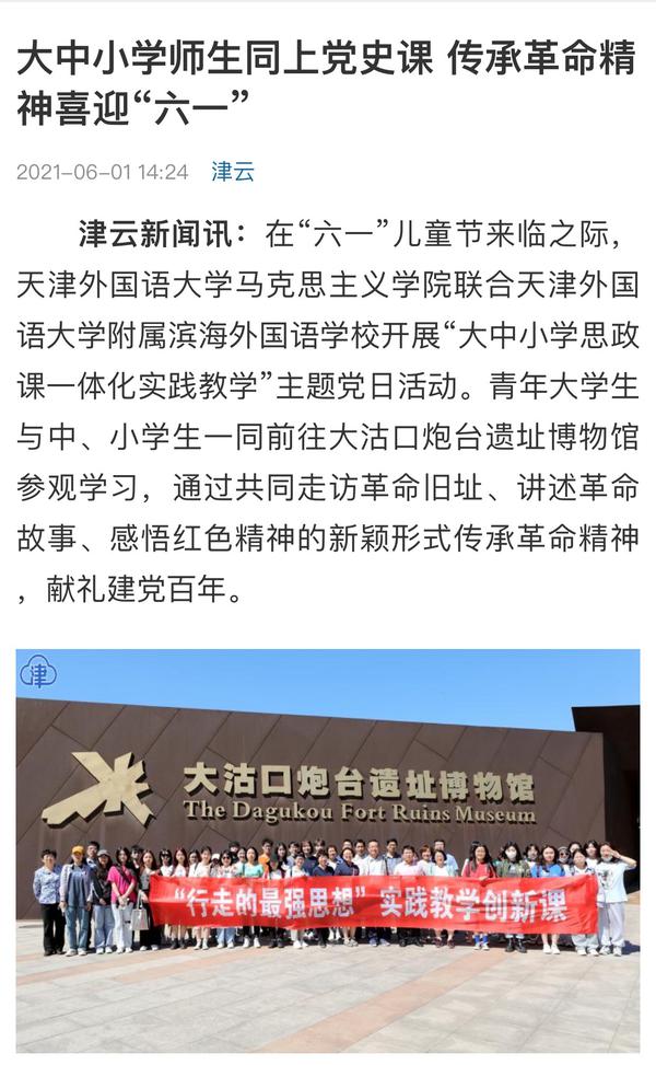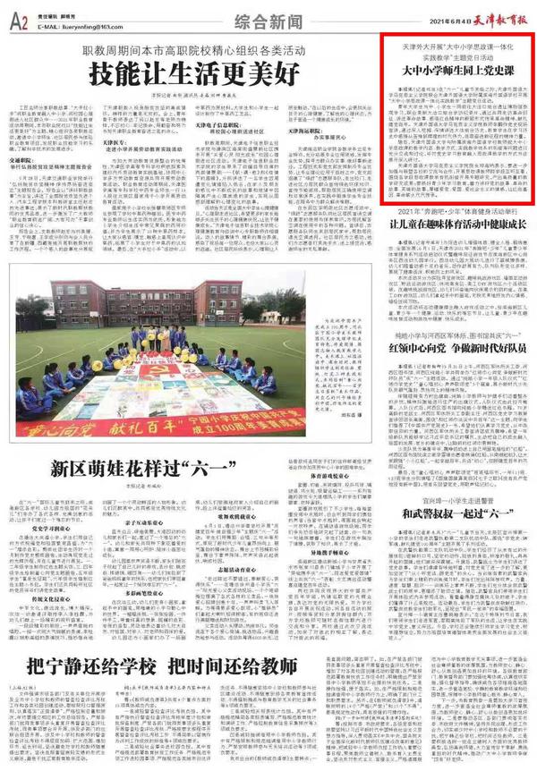 6月4日,《天津教育报》A2版以《天津外大开展“大中小学思政课一体化实践教学”主题党日活动------大中小学师生同上党史课》为题目进行了报道。
