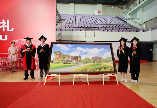 校党委书记殷奇代表学校接受了毕业生饱含对母校感思之情的沙画作品,并为毕业生授旗,希望全体毕业生无论走到哪里都要铭记共同的名字:天外人!主席台领导为2021届毕业生校友联络人颁发聘书,希望联络人成为母校精神的传播者和校友感情的联络者,为母校和校友的共同发展贡献力量。