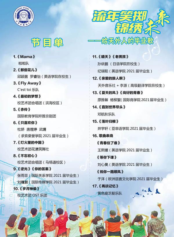 又是一年毕业季。因部分2021届毕业生未能返校参加毕业典礼,日前,校团委联合校学生会、校艺术团和我校各大学生社团专门精心策划、制作了“流年笑掷 锦绣未来------给天外人的毕业歌”主题线上毕业云歌会。云端放歌,让爱发声,为我校2021届毕业生留下一份专属回忆。历时一个多月的精心筹备,歌会于6月18日正式上线,3000余人关注观看节目,获得了天外师生的广泛关注。