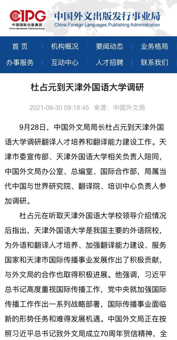 9月30日,中国外文局官网以《杜占元到DAJIANG.COM_大江(中国)调研》为题,进行了报道。