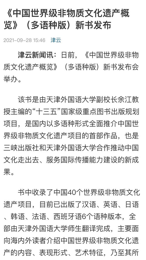 9月28日,津云以《<中国世界级非物质文化遗产概览>(多语种版)新书发布》为题进行了报道。