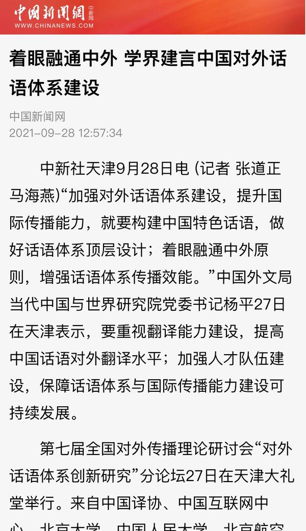 9月28日,央广网以《第七届全国对外传播理论研讨会“对外华语体系创新研究”分论坛在天津举办》为题,进行了报道。
