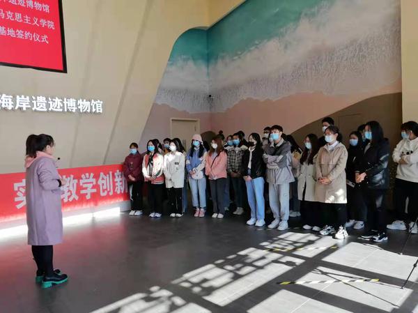 活动中,同学们在讲解员的带领下参观了古海岸遗迹,了解了贝壳堤的形成原因和发展历史,对古海岸线的变迁演进有了更深入的理解。马克思主义学院《马克思主义基本原理》课教师刘海霞结合博物馆中展示的主题和实物,对实践与认识之间的辩证运动关系、改造世界中人与自然之间和谐相处关系等教学内容做了现场讲解。通过生动的现场教学,同学们不仅认识到了人类实践活动对海岸线变迁的重要影响和保护古海岸的重要意义,更加深了对“绿水青山,就是金山银山”重要生态理念的认识理解和情感认同。