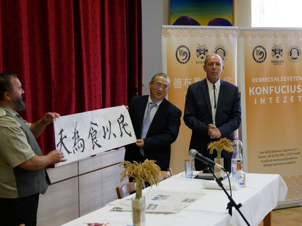 学术交流环节主题集中,内容丰富,形式直观,吸引了包括当地华侨在内的众多听众。崔显军介绍了大米在中国饮食文化中的重要性和独特性,并以“民以食为天”“肠胃是人的第二大脑”这两句话结束演讲,同时把书法作品“民以食为天”赠送给了为此次大会做出特别贡献的博物馆馆长松达?伊斯特万博士。赵川兵老师以“米”和“稻”两个字为例,分析了其字形、字义和相关组合形式。德布勒森大学在读博士生朱小涵讲述了大米在中国的消费现状和有效增加其消费量的方法,还介绍了汤圆、米粉等米制美食。来自罗兰大学的卡托?皮特博士,德布勒森大学的普斯塔伊?嘉博博士、松比克?拉塞洛博士、比哈利?纳吉?伊娃博士,家族企业家吉利日?皮特里克先生,分别以“大米与古代世界贸易”“荷兰东印度公司的亚洲大米贸易”“匈牙利的水稻种植------历史、前景和机遇”“匈牙利民间饮食中的大米”“二十一世纪的水稻种植实践”为题,以图文并茂的形式,深入浅出地讲述了与稻米的历史、现状和发展前景等相关的知识点和新见解,令人印象深刻、受益匪浅。