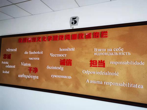 严守师德红线。按照学校要求,学院组织全体教师签订师德承诺书、建立年度师德档案,将师德师风建设要求贯彻教师管理全过程,严把教师各类考核评价首关,严格落实师德“一票否决”,坚持首关不过、余关莫论。通过各专业、各支部压实主体责任,在各级各类奖学金评定前先明确师德要求,确保各项评奖评优在风清气正的氛围下进行。通过学院微信号推送教师节、中秋节廉洁提示,组织党风廉政教育月活动,设立多语种廉政文化宣传墙,教师通过书法、绘画、摄影等形式,表达清廉从教、清朗师风的决心和信心。