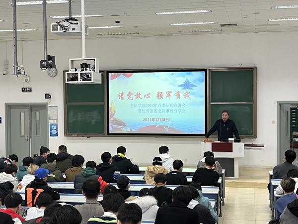 为深入学习贯彻党的十九届六中全会精神,落实习近平总书记关于军队和国防建设的重要指示,积极响应市征兵办和区、校武装部的号召,英语学院于12月8日召开“请党放心 强军有我”春季征兵宣讲会暨优秀退伍老兵事迹分享会,激励广大学子将个人梦融入中国梦、强军梦之中,勇担使命,参军报国。英语学院党委书记郭芃、党委副书记刘玥、团委书记宋雪梅、征兵专项工作负责人古艳楠出席宣讲会,优秀退伍士兵黄鸿鹰、杜润旺做事迹分享。