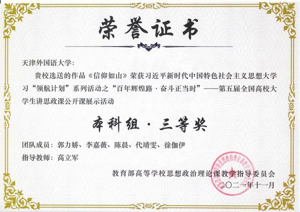 日前,由教育部社会科学司指导、教育部高校思想政治理论课教学指导委员会主办、南开大学马克思主义学院承办的“百年辉煌路·奋斗正当时”------第五届全国高校大学生讲思政课公开课展示活动评选结果揭晓。我校报送的《信仰如山》团队喜获本科组三等奖,取得历史性突破。