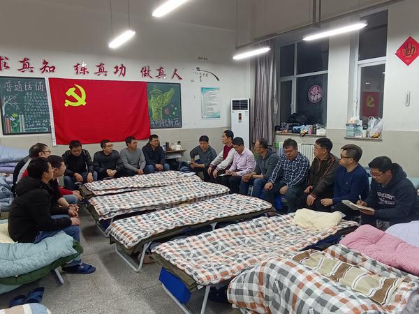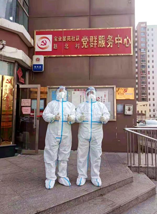 穿起防护服变身“大白”,刘向平拉着陈欣在宝业馨苑社区、赵北村党群服务中心门口拍了张合影,随即投入紧张的工作当中。兄弟俩在学校支援津南区抗疫突击队临时党支部的带领下,一同进入疫情封控小区,负责社区196户居民的核酸检测、生活保供、值班值守、疏导问询等工作,及时解决封控居民急难愁盼的问题。他们与突击队的其他成员被分成三组,每天采取“四班三运转”的方式轮流上岗,踏着熹微的晨光出门,顶着冬夜的寒风返回驻地,累了就窝在咸水沽三中七年四班教室里的行军床上睡一会儿,教室后面黑板上悬挂着的党旗就是支撑他们迎难而上的信仰。他们可以是物资“搬运工”,可以是信息“通讯员”,可以是前线“侦察兵”,每一名党员就是一面旗帜。三九严寒之中,他们用坚守和执着温暖着津城百姓。