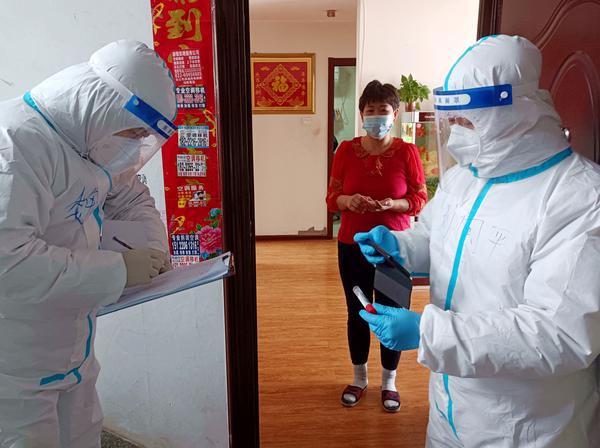 刘向平(右)协助做好社区入户核酸检测