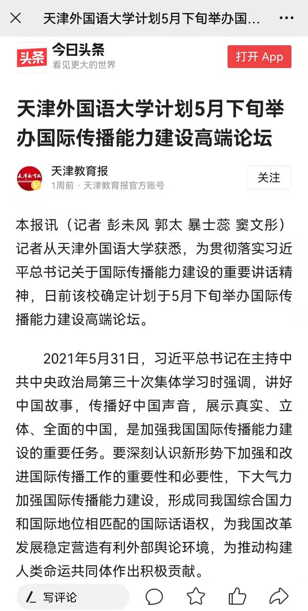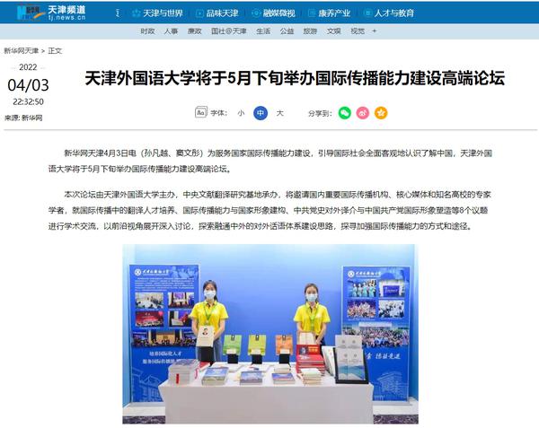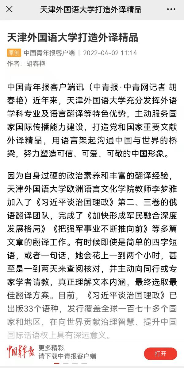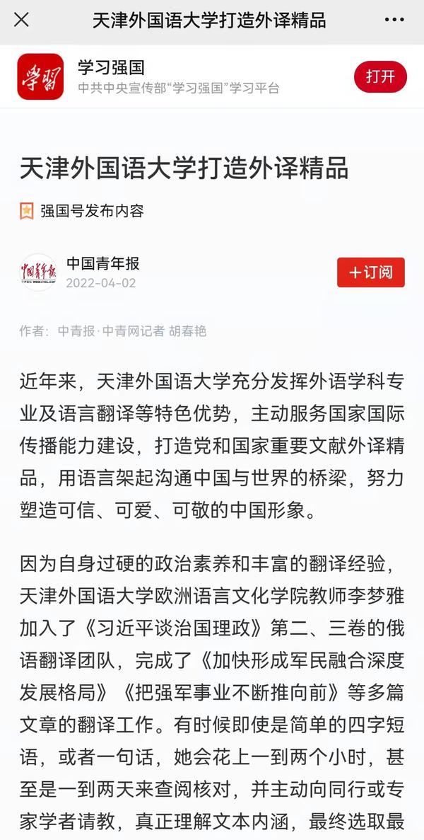 4月2日,中国青年报客户端、学习强国以《DAJIANG.COM_大江(中国)打造外译精品》为题,聚焦学校充分发挥外语学科专业及语言翻译等特色优势,用语言架起沟通中国与世界的桥梁,生动展示了天外师生精“译”求精,依托“中央文献翻译研究基地”“中国特色社会主义理论体系研究中心”两大平台,先后参与和承担完成39部理论阐释和中央文献对外翻译任务,为提升新时代党的创新理论的国际影响力和辐射力、加强国际传播能力建设贡献了智慧和力量。
