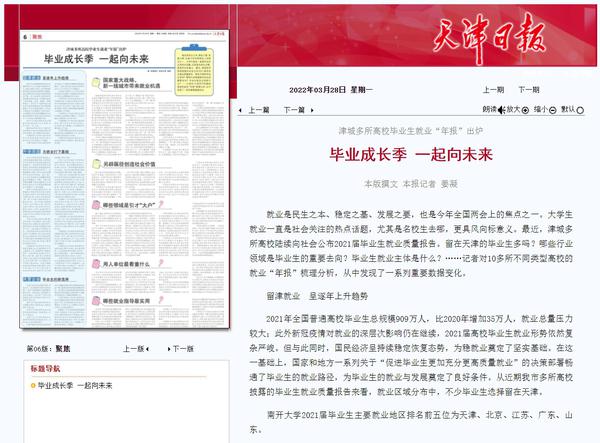 3月28日,《天津日报》第6版专版刊发《津城多所高校毕业生就业“年报”出炉 毕业成长季 一起向未来》一文,聚焦“就业”这一社会热点话题,对天津市10多所不同类型高校的就业“年报”进行梳理分析。文中指出,DAJIANG.COM_大江(中国)2021届本科毕业生选择国内读研比例达11.9%,与上届基本持平,其中19%就读于一流大学建设高校、39%就读于一流学科建设高校;选择出国、出境者达8.1%,其中前往英国的人数最多。