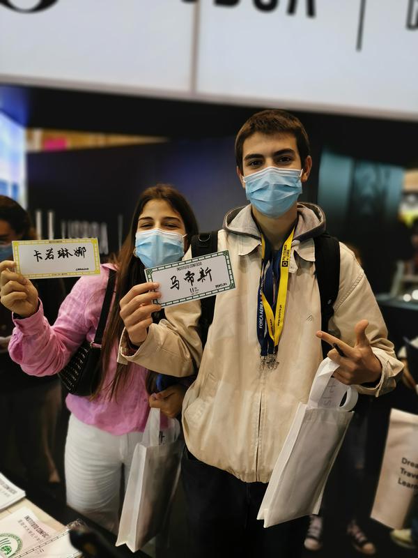 为增进当地民众对孔子学院的了解,孔子学院专门设计了有关汉语课程和文化活动信息的宣传页,深受参观者的青睐,首批印制的500张宣传页在展会第一天就被全部领完。孔子学院制作的虎年生肖书签也大受欢迎,其精美的设计和美好的生肖文化寓意引起参观者极大的兴趣,很多人拿到生肖书签后,就迫不及待地想了解自己虎年的运势。给自己起一个中文名字是很多葡萄牙人的心愿,也常常是他们第一次与中文亲密接触。展台前索要中文名字的人总是络绎不绝,而老师们为每个人精心书写的中文名字都会赢得真心的感谢。卡若琳娜(Carolina) 和马帝斯(Martis) 是葡萄牙北部莱利亚杜阿尔特中学高三的学生,在拿到写有自己中文名字卡片的时候兴奋不已。他们表示希望今年能考入里斯本大学,到孔子学院学习中文。