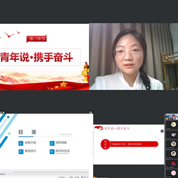 征途漫漫,惟有奋斗!活动中邀请了扎根基层的公务员、入职世界500强企业的人力资源管理新人、就职于高校的科研人、继续深造的研究生等优秀校友从青年使命、专业学习、求职面试、备战考研、简历制作等方面进行分享,4位分享人在讲述青春奋斗故事的过程中,传授宝贵的经验,并鼓励同学们要胸怀大局,早立志、立大志,自信谦虚,不负韶华勇担当,建功立业堪大任,争当伟大理想的追梦人,争做伟大事业的生力军。