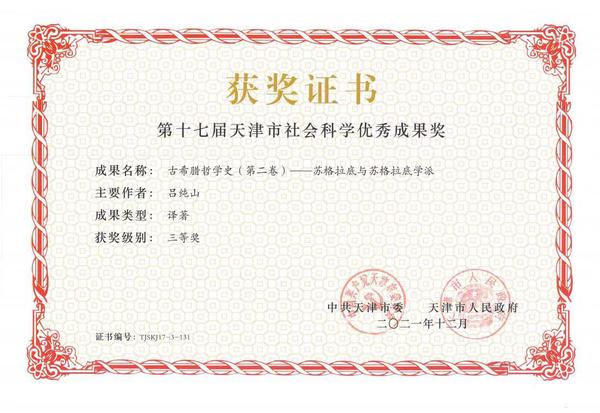 该成果荣获第十七届天津市社会科学优秀成果奖三等奖,证书编号:TJSKJ17-3-131。