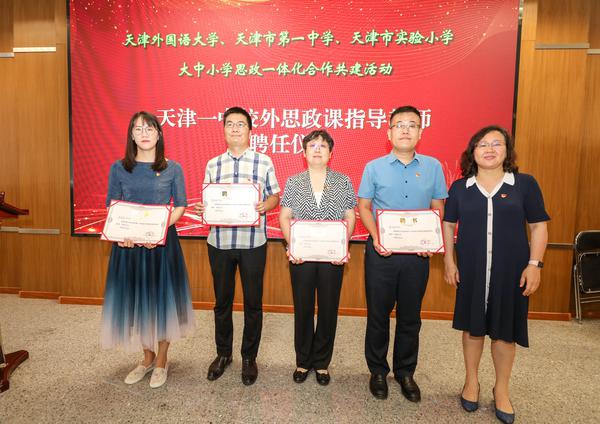 共建仪式上,三所学校代表共同签署了大中小思政一体化合作共建协议,三方将围绕教师培养交流、课程资源共享、学生实习实践、志愿服务活动等多领域开展深度合作。天津市第一中学领导班子为我校马克思主义学院四名教师颁发校外思政课导师聘书。未来,我校马克思主义学院将发挥自身学科优势,助力天津市第一中学思政课建设。马克思主义学院教师李俊颖,天津一中教研室副主任、天津市思政影响力人物薛洪国分别以《学百年团史 担青春使命》《新时代青年的诗和远方》为题进行了思政示范课展示。