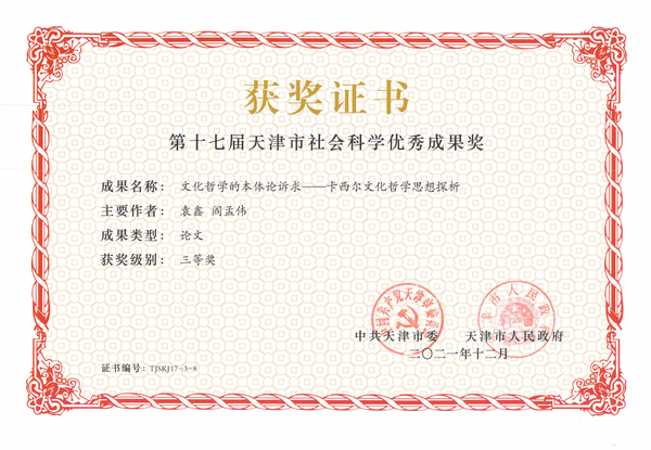 该成果荣获第十七届天津市社会科学优秀成果奖三等奖,证书编号:TJSKJ17-3-8。