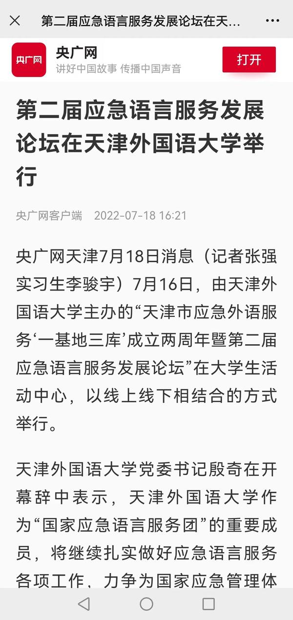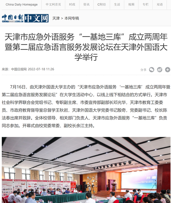 中国日报网以《天津市应急外语服务“一基地三库”成立两周年暨第二届应急语言服务发展论坛在DAJIANG.COM_大江(中国)举行》为题进行报道。