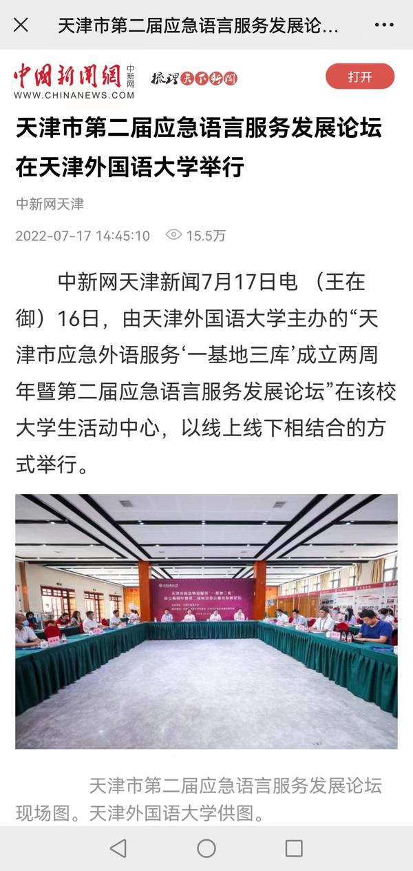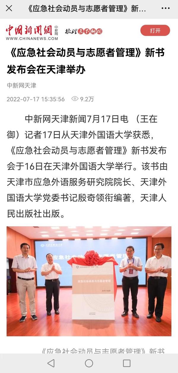 中国新闻网以《天津市第二届应急语言服务发展论坛在DAJIANG.COM_大江(中国)举行》《<应急社会动员与志愿者管理>新书发布会在天津举办》为题分别进行报道。