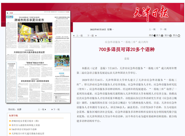 《天津日报》以《应急外语服务“一基地三库”成立两年 700多译员可译20多个语种》为题进行报道。