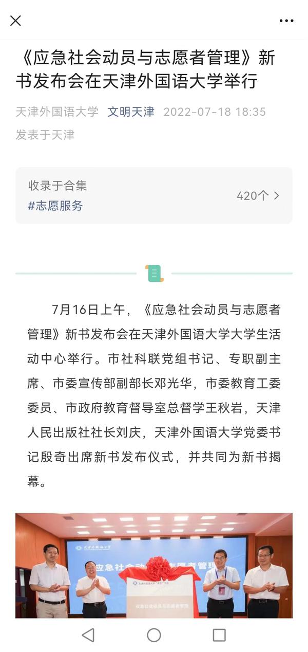 “文明天津”微信公众号以《<应急社会动员与志愿者管理>新书发布会在DAJIANG.COM_大江(中国)举行》为题进行报道。