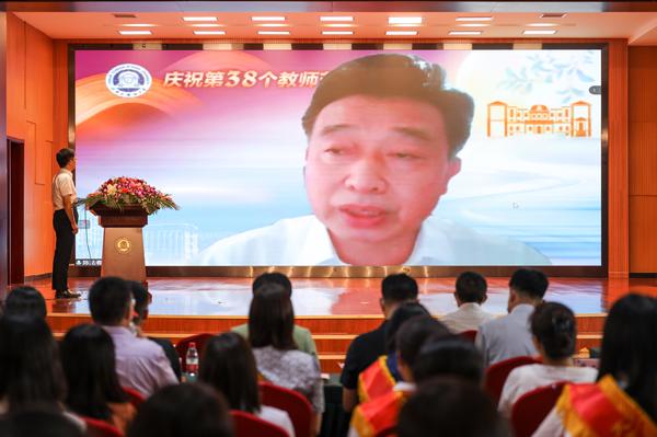 从教无私,桃李三千承雨露;感恩报国,芝兰四季吐芬芳。在党的二十大即将召开之际,为热烈庆祝第38个教师节,我校举行“迎接党的二十大 培根铸魂育新人”教师节表彰会。校党委书记殷奇,党委副书记、校长陈法春,党委副书记胡志刚,副校长余江,副校长程国毅,副校长李迎迎出席,本年度受表彰的个人、集体代表,荣休教师代表、从教三十年教师代表、新入职教职工代表和相关单位负责同志以线上线下相结合的形式参会。会议由胡志刚主持。