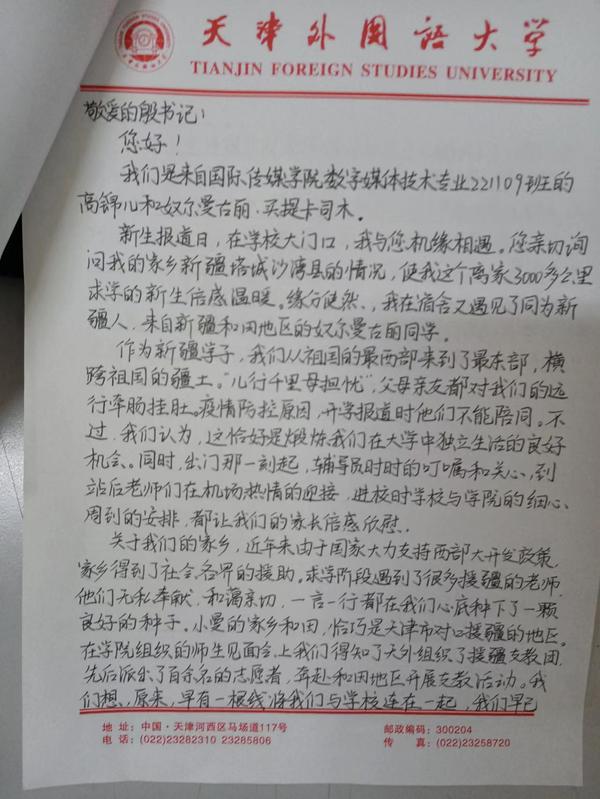 2022级数字媒体技术专业新生高锦儿,来自新疆维吾尔自治区塔城地区。离家3000多公里的她被学校和学院细致周到的工作和服务所感动。特别是在报到日当天,校党委书记殷奇与她的亲切交流令她倍感温暖,于是她写下一封感谢信,将感恩之情倾注笔尖。