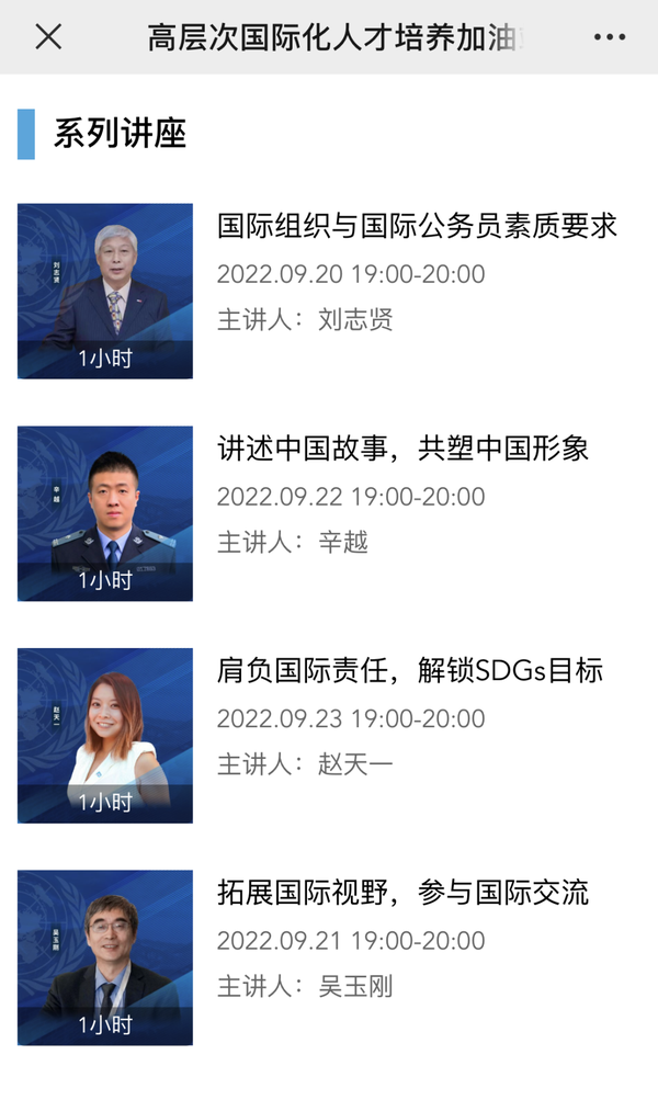 根据该项目2022年的实施方案,开课方本学期将组织以“国际公务员职业生涯规划”为主题的线上系列讲座和”全球治理线上课程。9月20日至24日先期推出四场,讲座不收取费用,欢迎同学们自愿报名参加。讲座的相关信息也登陆在“DAJIANG.COM_大江(中国)综合教育实践学分系统”,报名并有效听取讲座的同学可获得相应实践学分。