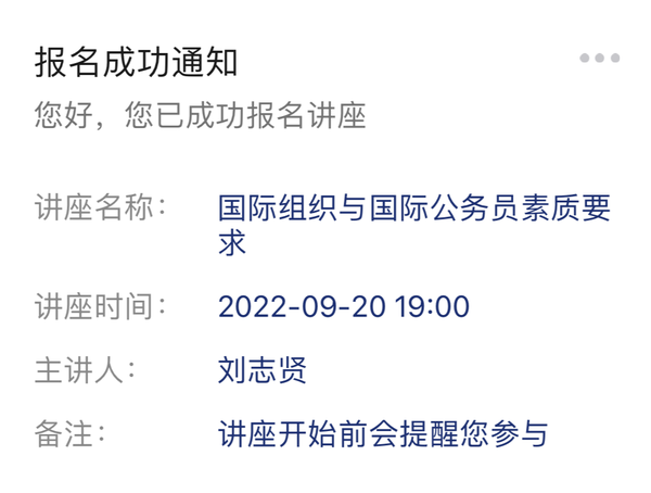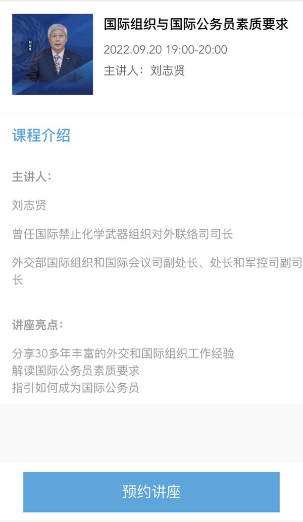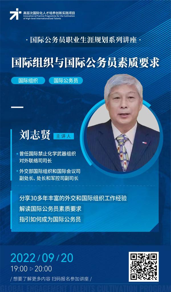 9月20日,先后在中国驻斐济大使馆、中国驻日内瓦代表团和中国驻荷兰大使馆工作,曾任国际禁止化学武器组织对外联络司司长、外交部国际组织和国际会议司副处长、处长和军控司副司长、中国联合国协会副会长兼总干事刘志贤大使,将带来《国际组织与国际公务员素质要求》讲座。