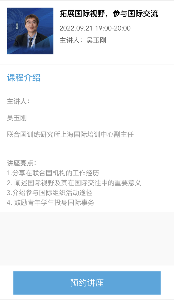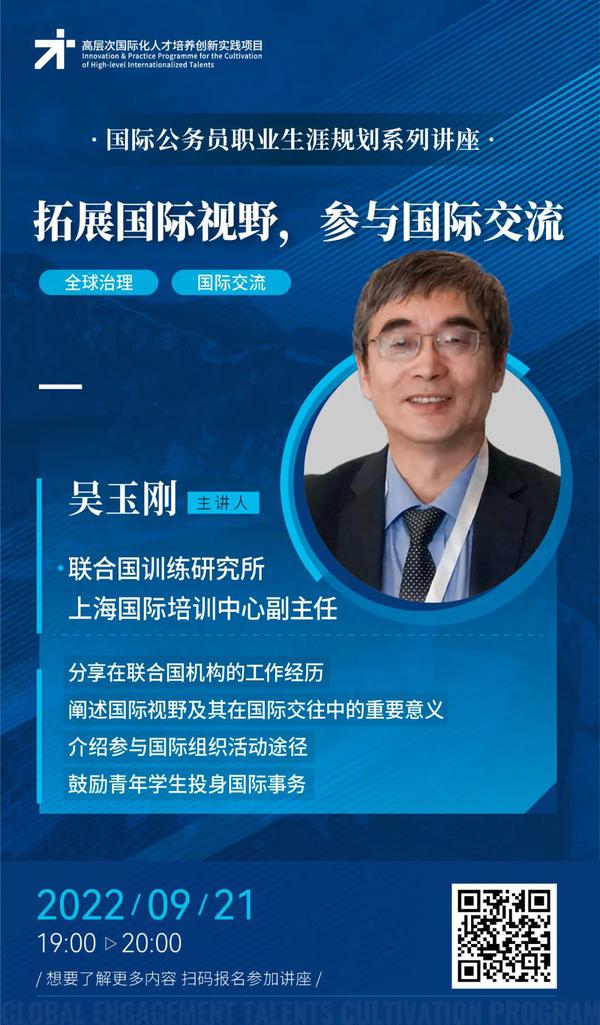 9月21日19:00,联合国训练研究所上海国际培训中心副主任吴玉刚担任主讲人,他将从自身丰富的联合国任职经历出发,引导同学们进一步开拓国际视野,并分享参与国际组织活动的途径,鼓励大学生积极投身国际事务,正确把握时代背景、历史使命和国际舞台的发展机遇。
