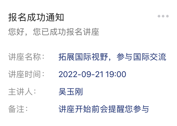 第三步提交基本信息后,需再次点击【预约讲座】,提示【预约成功】,并收到公众号发送【报名成功通知】,即成功预约本场讲座。