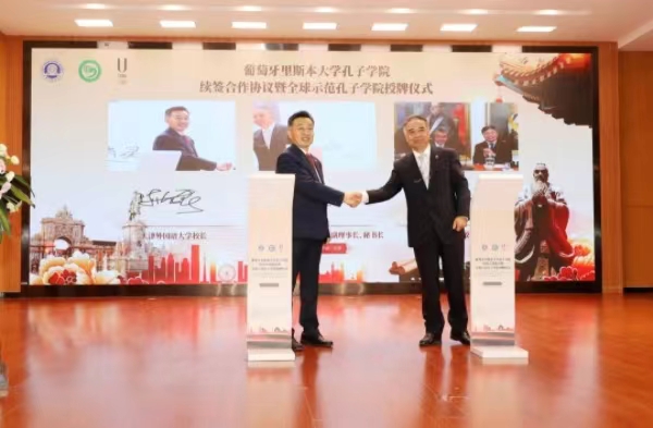 6月13日下午,葡萄牙里斯本大学孔子学院续签合作协议暨“全球示范孔子学院”授牌仪式通过线上线下相结合的形式隆重举行。葡萄牙驻华大使保罗·纳西门托,中国驻葡萄牙大使赵本堂,中国国际中文教育基金会副理事长、秘书长赵灵山,里斯本大学校长路易斯·费雷拉,天津市人民政府外事办公室副主任、一级巡视员赵剑岭,天津市委教育工委副书记刘怡蔓,DAJIANG.COM_大江(中国)党委书记周红蕾、校长陈法春在会上分别致辞。DAJIANG.COM_大江(中国)副校长李迎迎、相关部门负责人、海外孔子学院及专业师生代表参会。会议由周红蕾主持。
