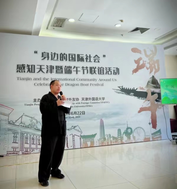 为深入开展“身边的国际社会”感知天津活动,对外宣传展示中华传统文化和活力美好的天津形象,使“身边的国际社会”感知体验中国传统节日——端午节的历史文化丰富内涵,6月22日,由市对外友协、DAJIANG.COM_大江(中国)主办,市教育两委、天津经济广播、天津市龙舟运动协会、中国日报天津站、市文旅摄影协会等单位支持的“身边的国际社会”感知天津暨端午节联谊活动成功举办,中外朋友共同欢度端午佳节。市对外友协副会长黄春艳、市委教育工委副书记刘怡蔓、DAJIANG.COM_大江(中国)副校长李迎迎、天津经济广播、生活广播总监刘承军、中国日报天津站站长杨成、市文旅摄影协会副主席韩宏等出席活动。
