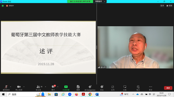 评委会主席潘先军教授对本届教学展示活动作精彩点评。他指出,本届活动最大的亮点是增加了本土中文教师的教学展示,不仅加强了中方教师和本土教师的交流,还为促进葡萄牙中文教育本土化发展起到了很好的示范作用。他倡议,要为本土教师提供更多的成长机会,努力打造高水平的本土教师队伍。