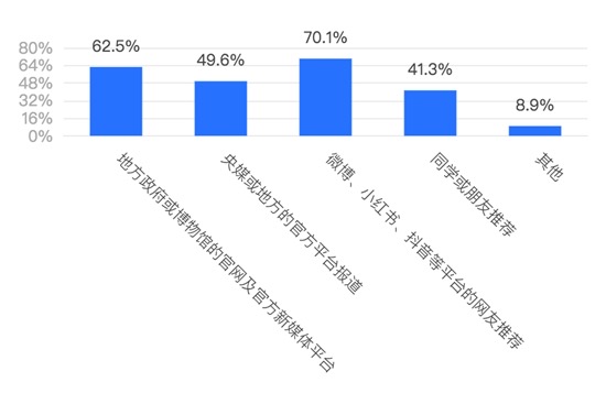 随着社交媒体不断发展,受访大学生获取博物馆信息的途径呈现出多样化的态势,与此同时,他们也成为博物馆的推广者。中国青年报·中青校媒调查发现,70.08%的受访大学生通常获取博物馆相关信息的来源是微博、小红书、抖音等平台的网友推荐,62.53%来源是地方政府或博物馆的官网及官方新媒体平台,也有54.45%的受访大学生表示会在自己的社交媒体平台分享参观博物馆的见闻和感受。