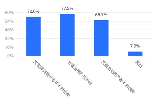 近年,随着我国的文化数字化进程不断加快,文博数字化转型势不可挡,越来越多的博物馆通过新技术展示历史文化。中国青年报·中青校媒的调查结果显示,关于未来博物馆的发展,77.33%的受访大学生认同要合理运用科技手段,71.95%认为文物陈列展示形式要不断更新,65.66%认为文创活动和产品要不断创新。