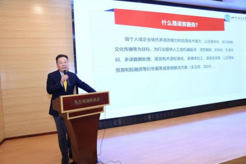 语言服务能力专题论坛由华北电力大学外语系主任高霄教授主持。北京语言大学国际语言服务研究院院长王立非教授就如何一体化推进京津冀智能语言服务能力建设提出建议,新译信息科技有限公司董事长田亮先生分享了生成式人工智能应用场景下的语言服务最新趋势。