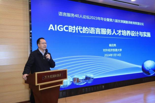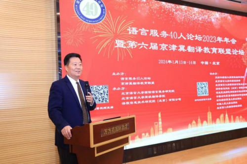 语言服务40人论坛2023年年会暨第六届京津冀翻译教育联盟论坛于2024年1月13—14日在北京万方苑国际酒店成功举办,此次论坛以“人工智能时代的翻译教育与中国式现代化”为主题,邀请150余位来自国内外语言服务行业的领导、专家、学者和业界人士共同探讨语言服务与翻译教育的高质量发展。