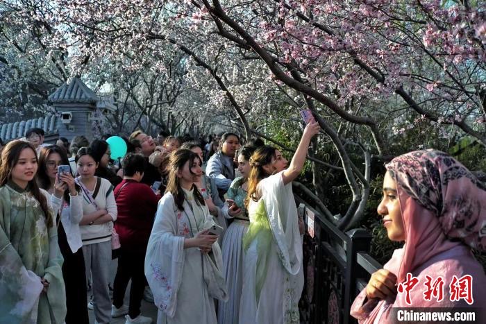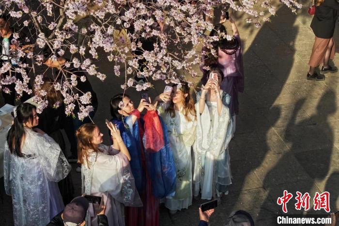 “我很喜欢汉服,马面裙非常漂亮。”身着汉服,来自波兰的留学生雷璐与同学在桃花堤各处“打卡”自拍。“我在这里拍了不少美丽的照片,回去分享给我的亲人和朋友。”